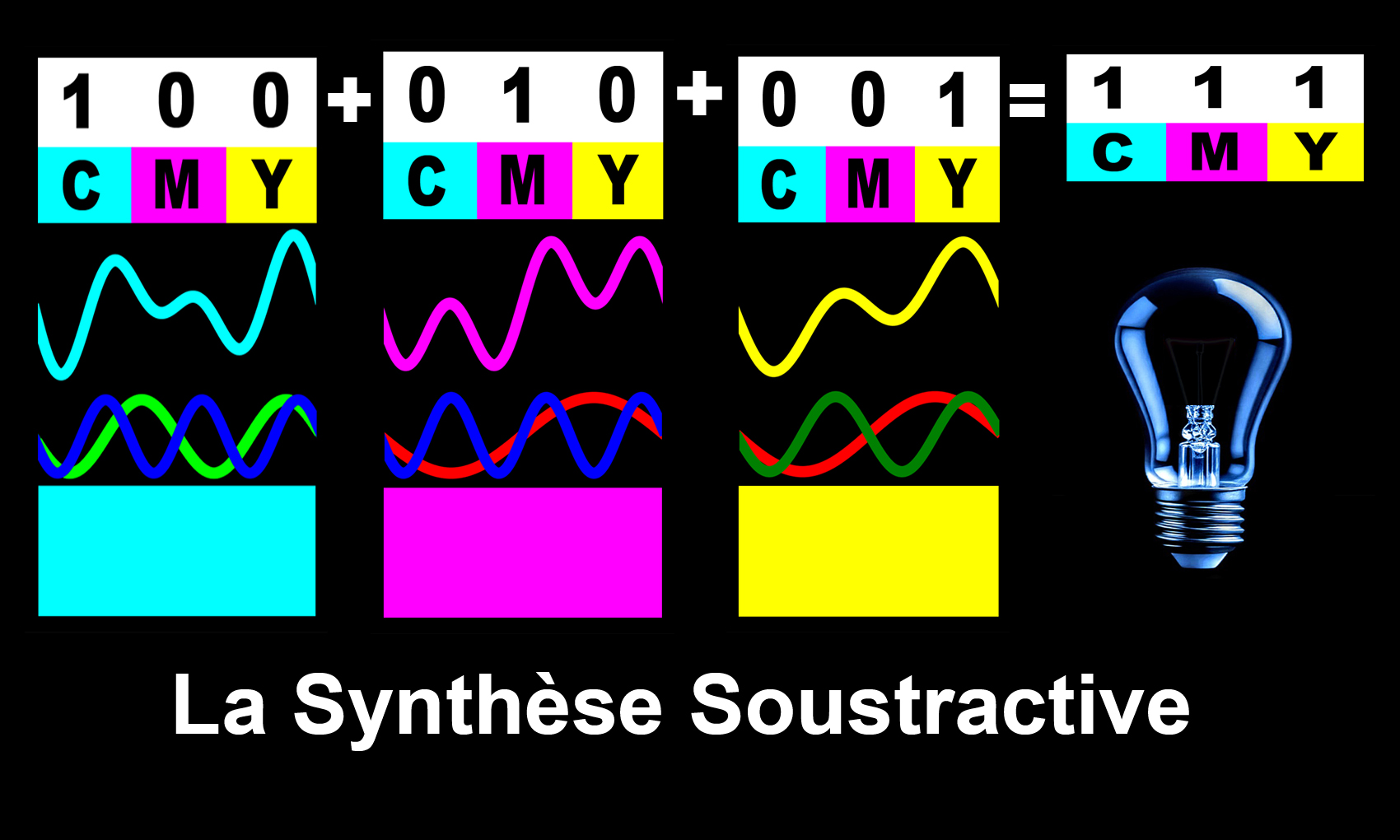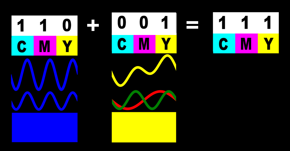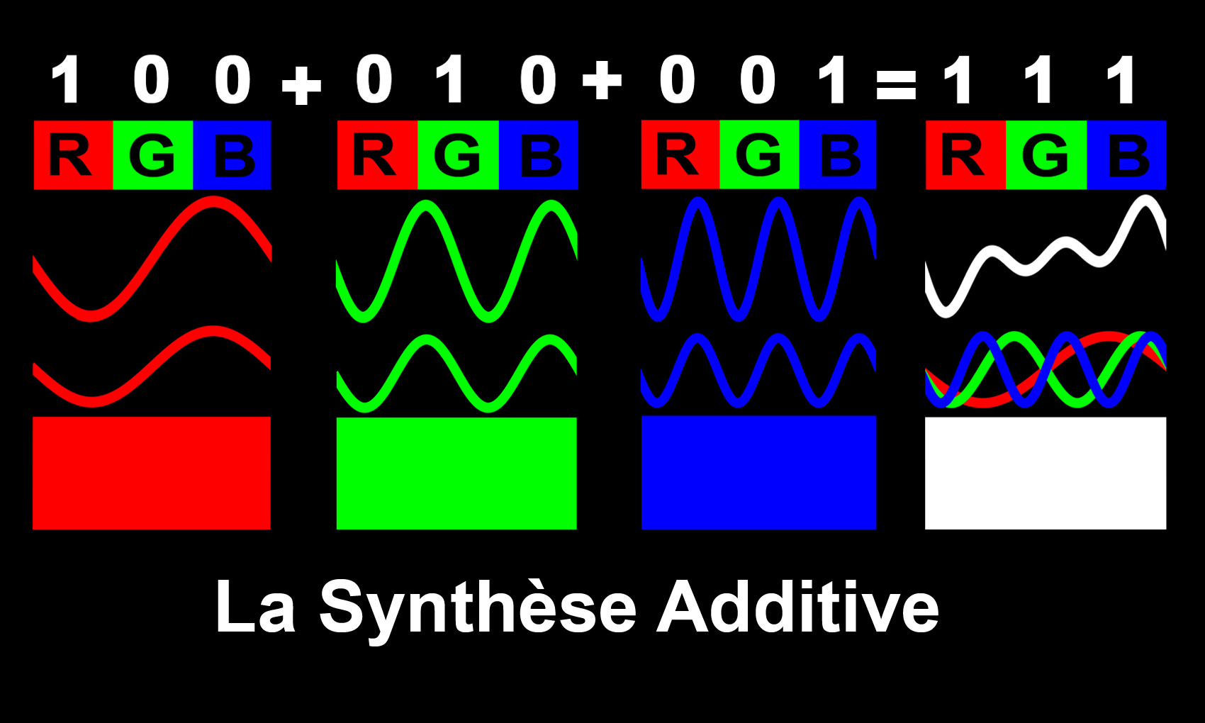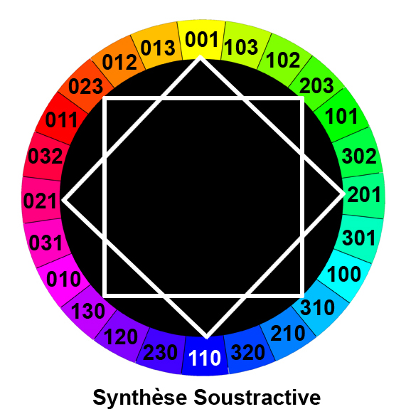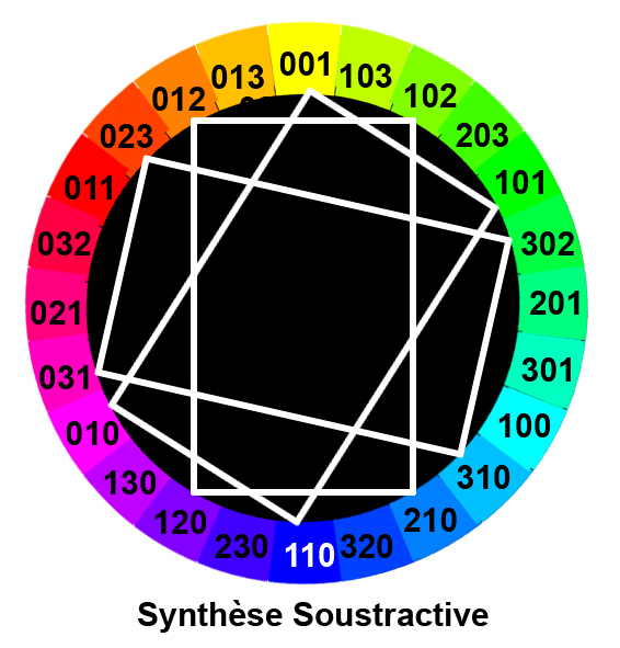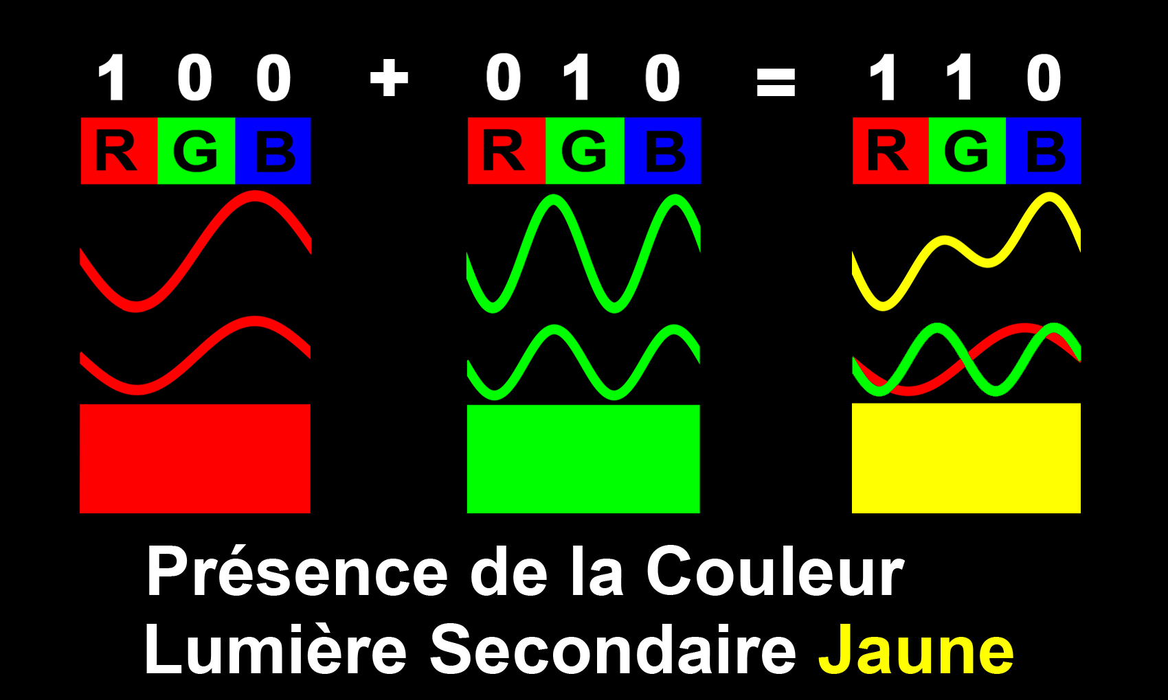 Par exemple, (110) représente la lumière jaune, puisque les lumières rouge et verte sont présentes, mais pas la composante bleue. (100)+(010) = (110).