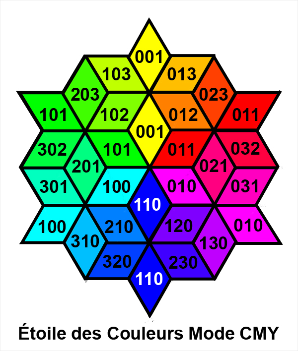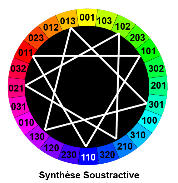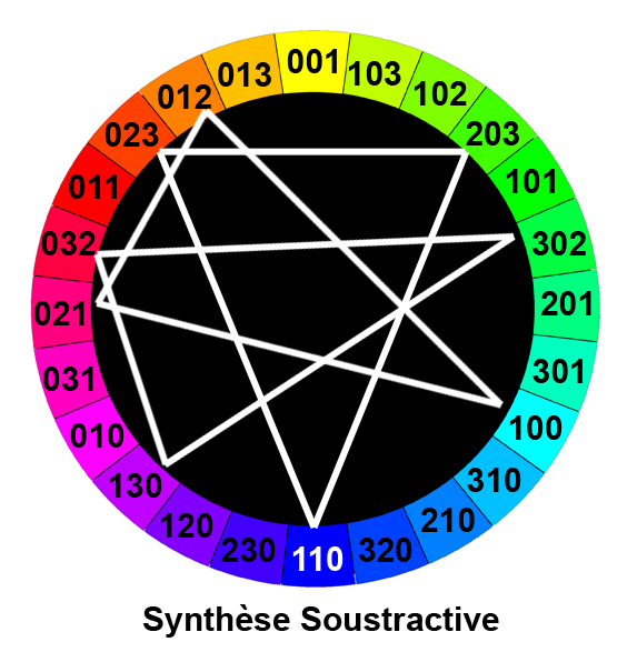 Après ces six couleurs fondamentales, toutes les autres couleurs sont obtenues par des rapports de proportions, soit entre les photons (mode RGB), soit entre les pigments [mode CMY].