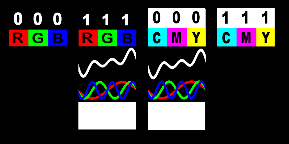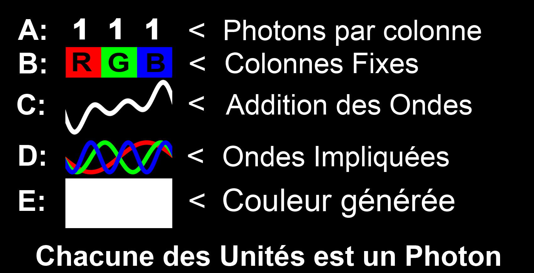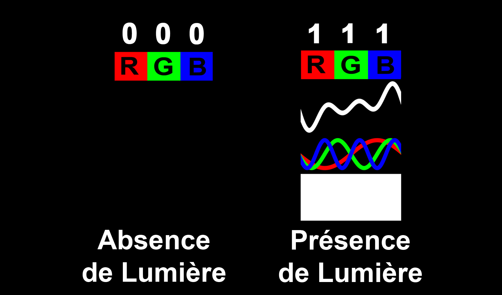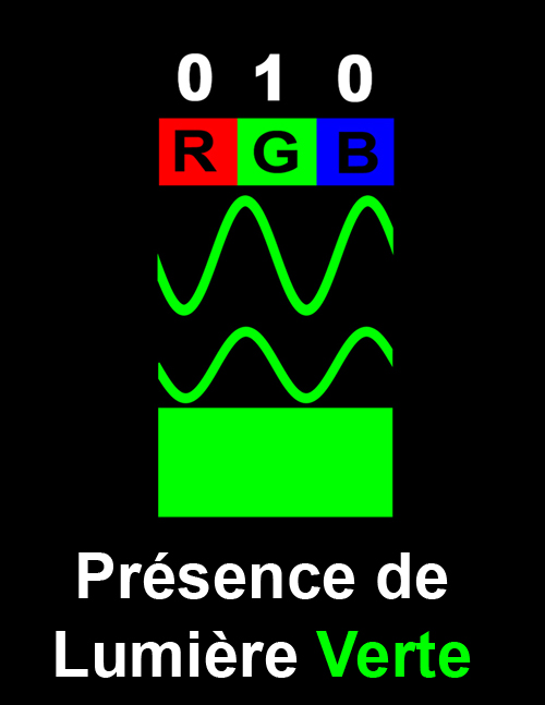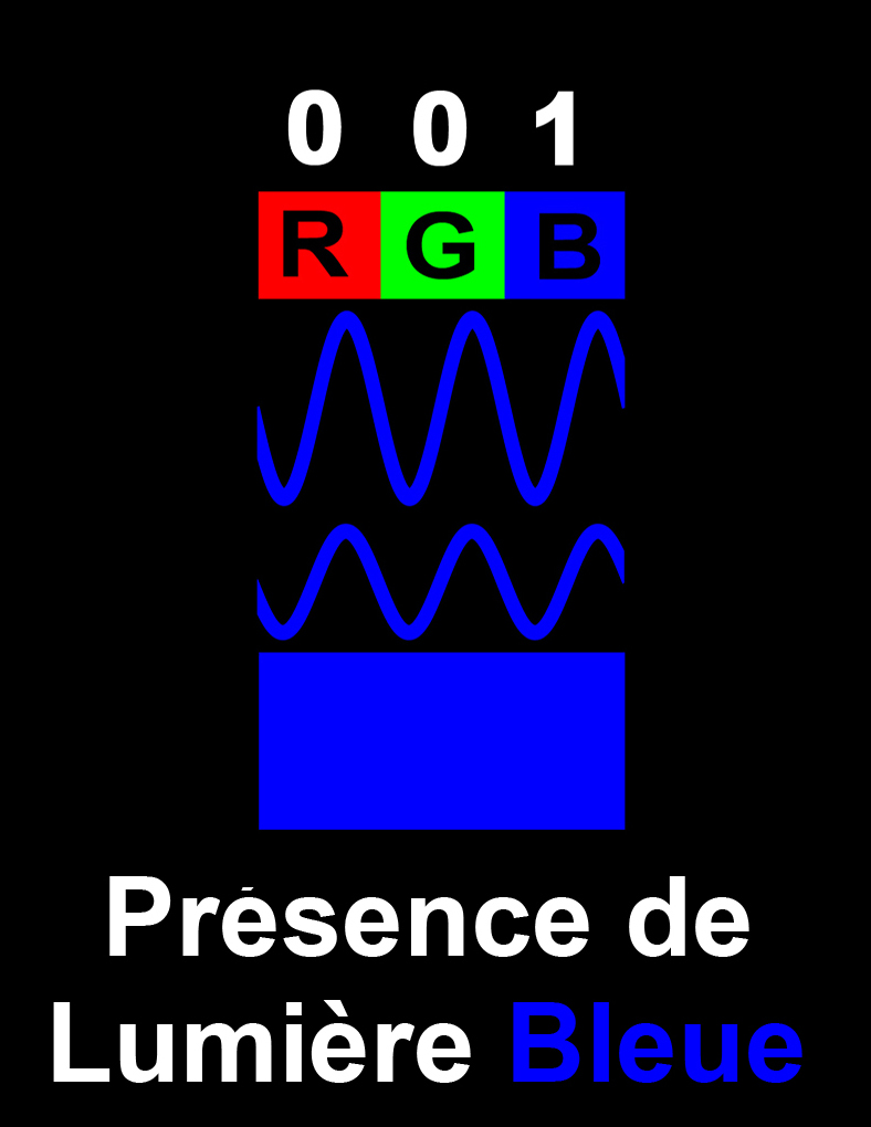 Si les trois photons de couleurs différentes (un rouge, un vert et un bleu) sont présents, avec une valeur de 1 dans chaque colonne (111), la lumière devient blanche. Sans photons, la lumière n'existe pas (000), ce qui symbolise la couleur noire.