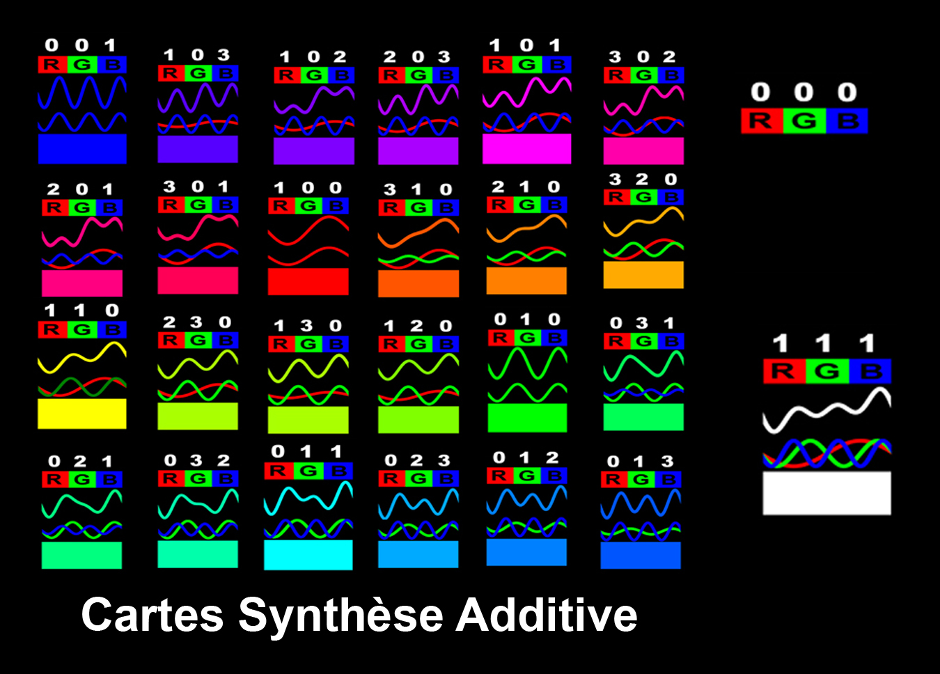 IMG.4 Les 24 Cartes de la Synthèse Additive RGB avec les cartes (000) et (111).