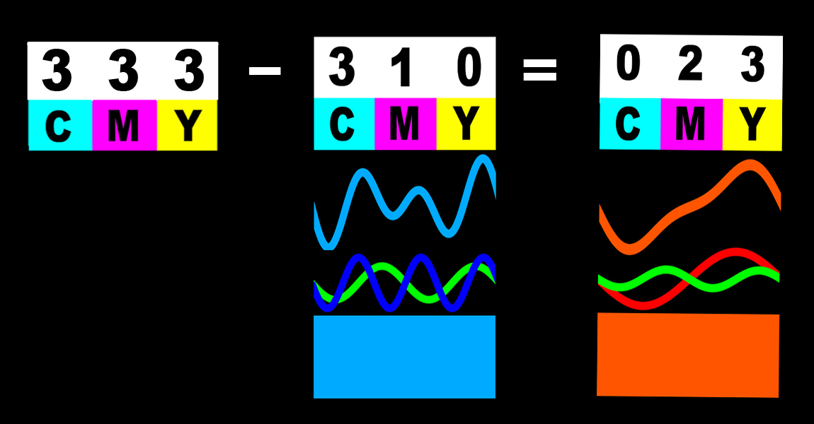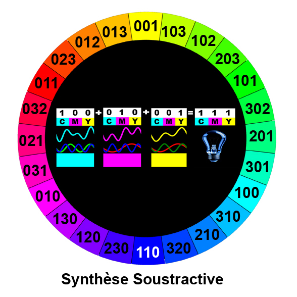Dans cette synthèse, les chiffres sont noirs sur fond blanc. Chacune des Couleurs-Pigment absorbe une proportion de la Couleur-Lumière Blanche et laisse rebondir vers l'œil les Photons non absorbés par les Pigments.