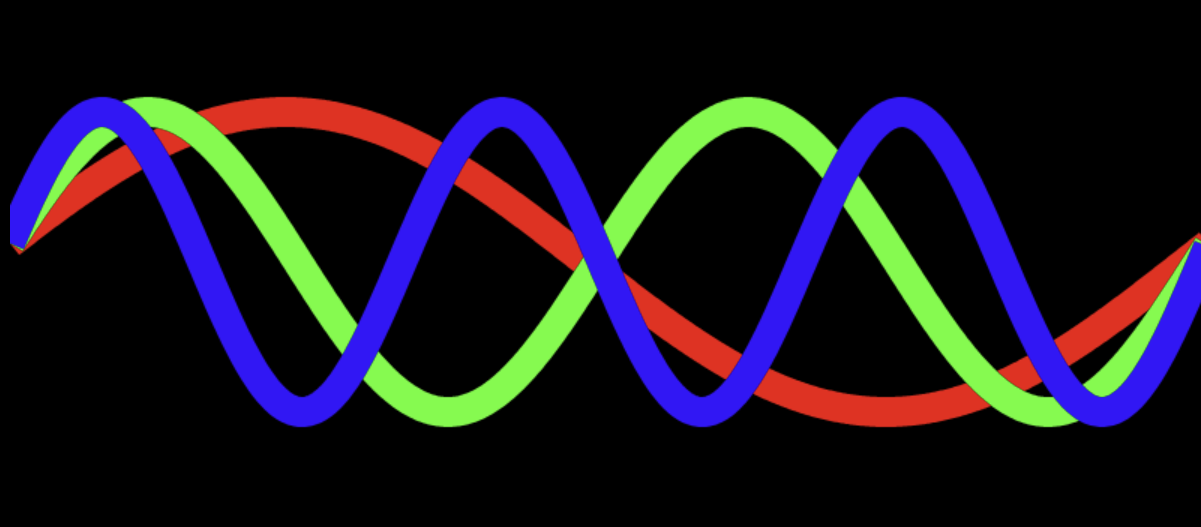 L'Addition des deux Ondes (Rangée D) donne l'Onde d'interférence Jaune (Rangée C)