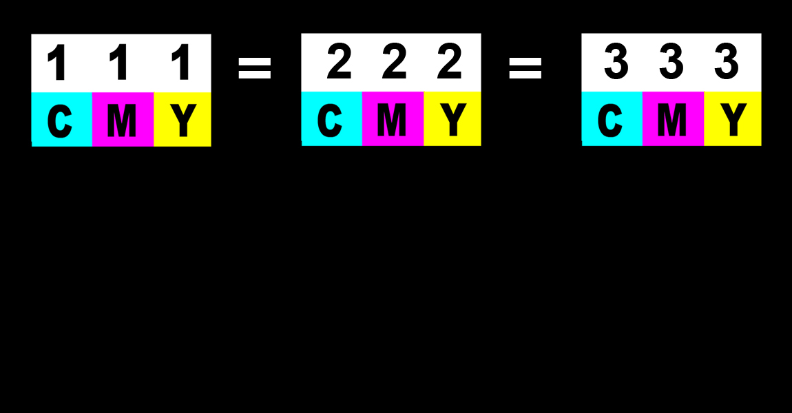 La couleur-lumière RGB sera représentée par des parenthèses : (111), tandis que la couleur-pigment CMY sera indiquée par des crochets : [111].