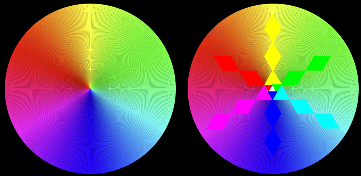 Les couleurs primaires RGB créent les trois axes de base du cycle, avec des rayons séparés par 120 degrés. À mi-chemin de chacun de ces segments de 120 degrés, des interférences lumineuses se forment.Ce sont les trois axes secondaires de lumière CMY. Il est remarquable que, dans un cercle chromatique, ces six axes (RGB-CMY) génèrent toutes les autres couleurs. Ils se propagent en conservant leurs couleurs pures à l'infini, tandis que les autres couleurs se subdivisent de manière exponentielle.